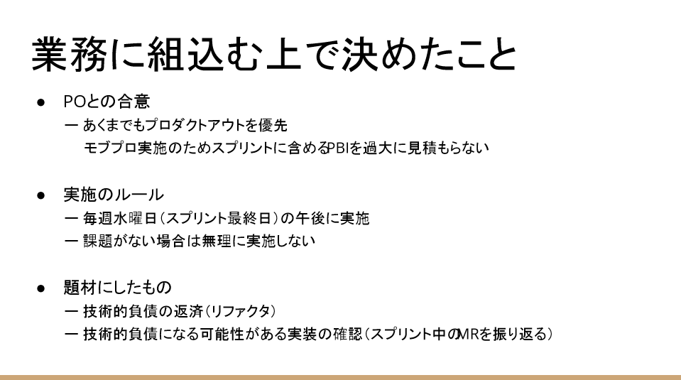 以前に取り組んでいたモブプログラミングを実際に業務プロセスの一部として盛り込んでみた、というお話でした。モブプログラミング自体の取り組みついてはMeetupの記事をご参照ください。