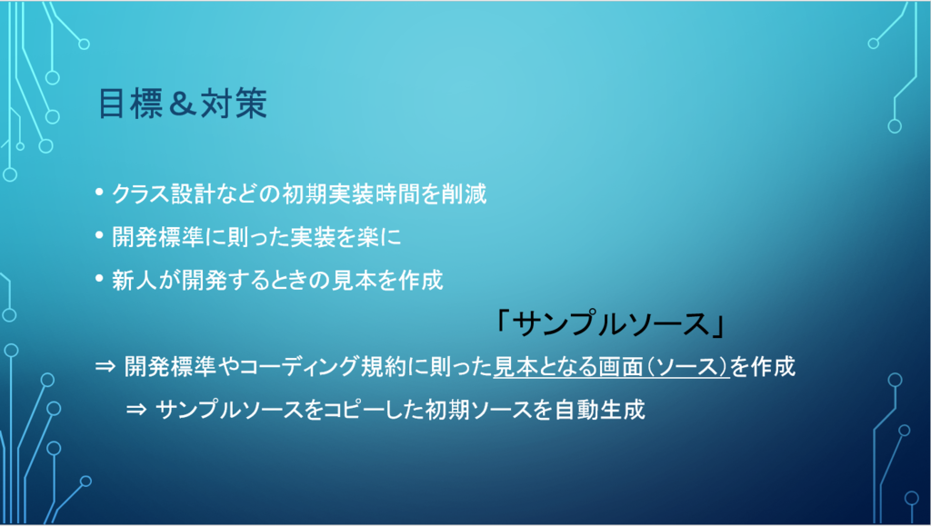 開発規約に準拠したコードを作成し、さらにそれをテンプレートとして新規コードを起こす際に自動生成するツールも作成したというお話でした。