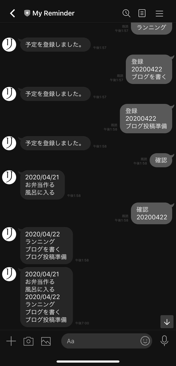 予定の登録や確認ができ、19時に予定の通知がきました!