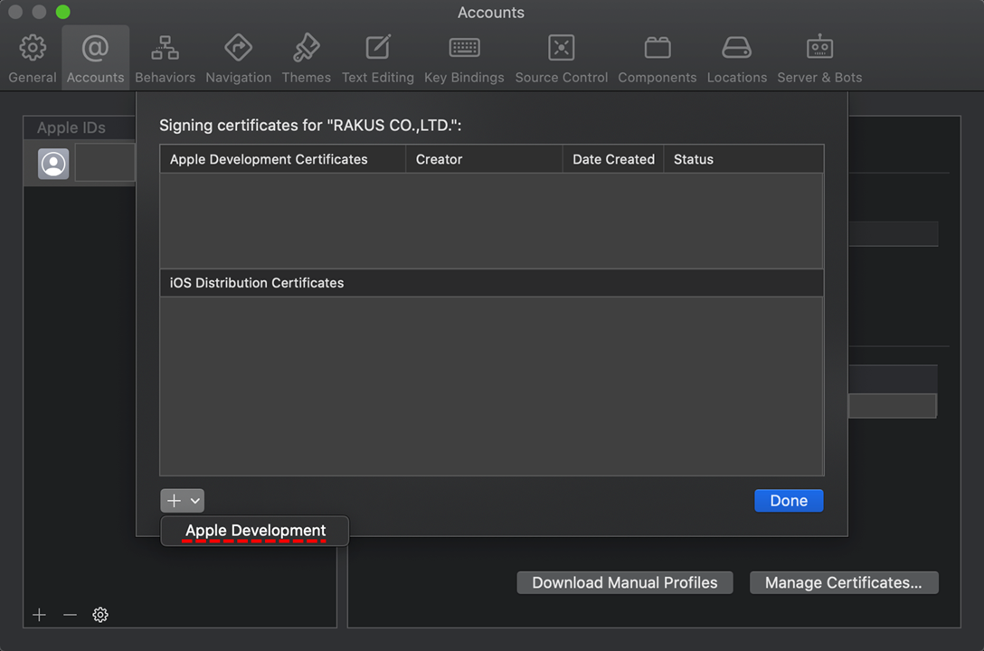 メニューバー > Xcode > Preferences > Accounts 画面へ進み、右下の「Manage Certificates…」をクリックします。