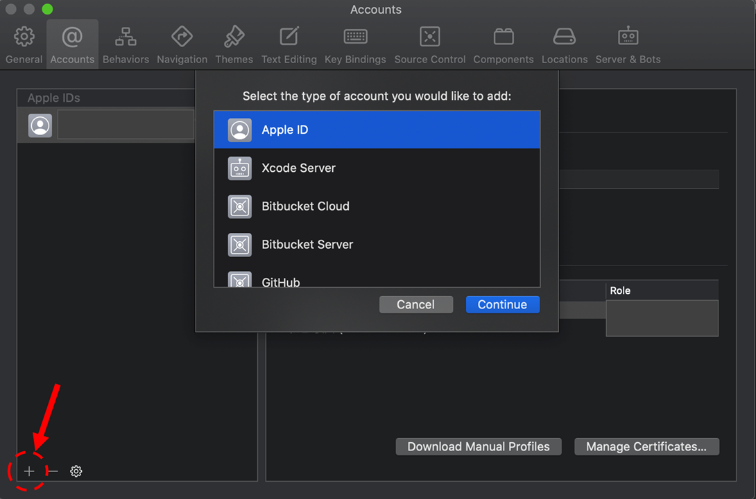 メニューバー > Xcode > Preferences > Accounts 画面へ進み、左下の「+」→「Apple ID」→「Continue」の順にクリックします。