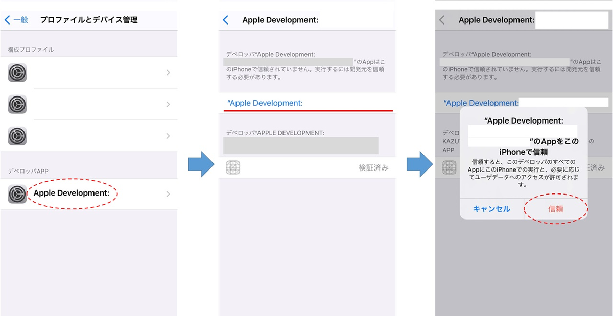 以下の手順を「接続しているiPhone」で行うとアプリが実行可能になります。