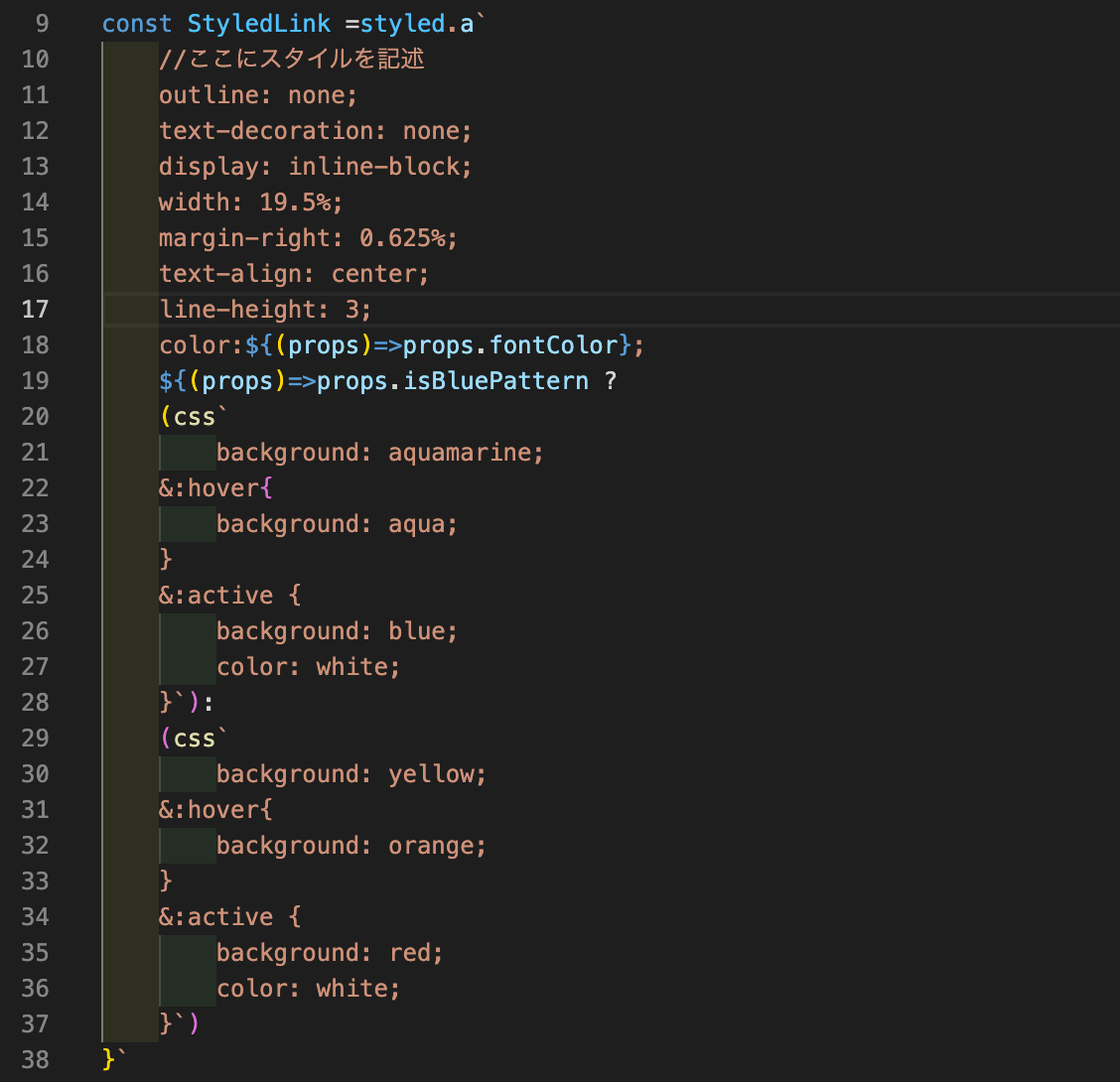 import React from "react"; import styled from 'styled-components' export const Link = ({to,children}) => { return <StyledLink href={to}>{children}</StyledLink> }; const StyledLink =styled.a` //ここにスタイルを記述 outline: none; text-decoration: none; display: inline-block; width: 19.5%; margin-right: 0.625%; text-align: center; line-height: 3; color: black; background: yellow; &:hover{ background: orange; } &:active { background: red; color: white; } `