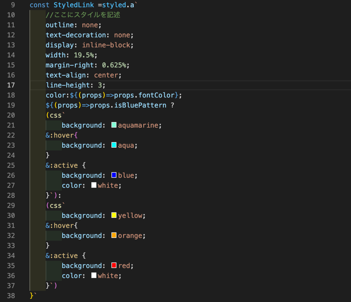 import React from "react"; import styled,{ css } from 'styled-components' export const Link = ({to,children,fontColor,isBluePattern}) => { return <StyledLink href={to} fontColor={fontColor} isBluePattern={isBluePattern}>{children}</StyledLink> }; const StyledLink =styled.a` //ここにスタイルを記述 outline: none; text-decoration: none; display: inline-block; width: 19.5%; margin-right: 0.625%; text-align: center; line-height: 3; color:${(props) => props.fontColor}; ${(props) => props.isBluePattern ? (css` background: aquamarine; &:hover{ background: aqua; } &:active { background: blue; color: white; }`): (css` background: yellow; &:hover{ background: orange; } &:active { background: red; color: white; }`) }`