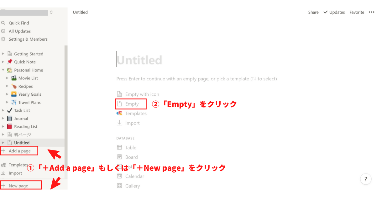 Notion管理画面左のサイドバーにページ一覧があり、ドキュメント/メモを追加作成するには「+Add a page」、もしくは「+New page」をクリックするとドキュメント/メモ作成ができます。