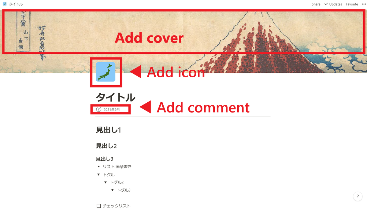 ドキュメント内のタイトル上部にカーソルを合わせると、アイコン、カバー画像、コメントを設定できるメニューが表示され、クリックするとドキュメント/メモの装飾もできます。