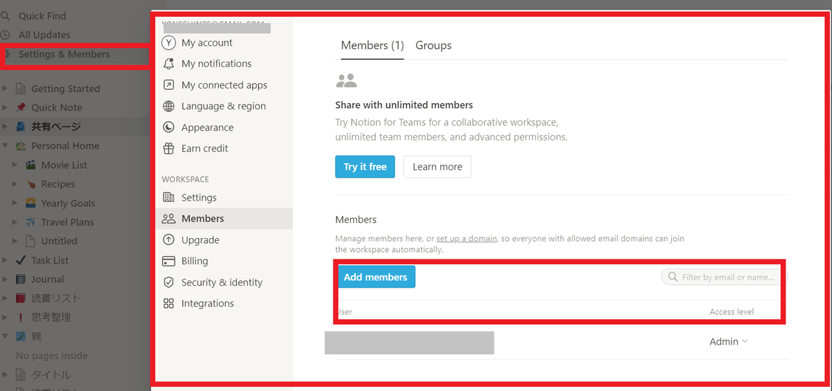 Inviteをクリック- 追加したいメンバーにNotionへの招待メールが届く