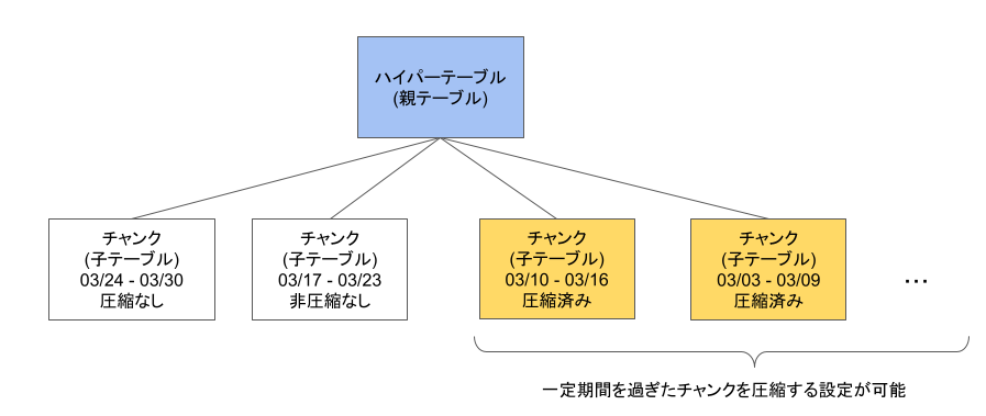 圧縮したチャンクにはUPDATEはできませんが、ログのような時系列データを格納する場合は更新処理は実施しないため問題となりません。