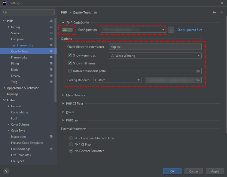 PHP > Quality Tools内にPHP_CodeSnifferがあるので、そこから設定することができます。