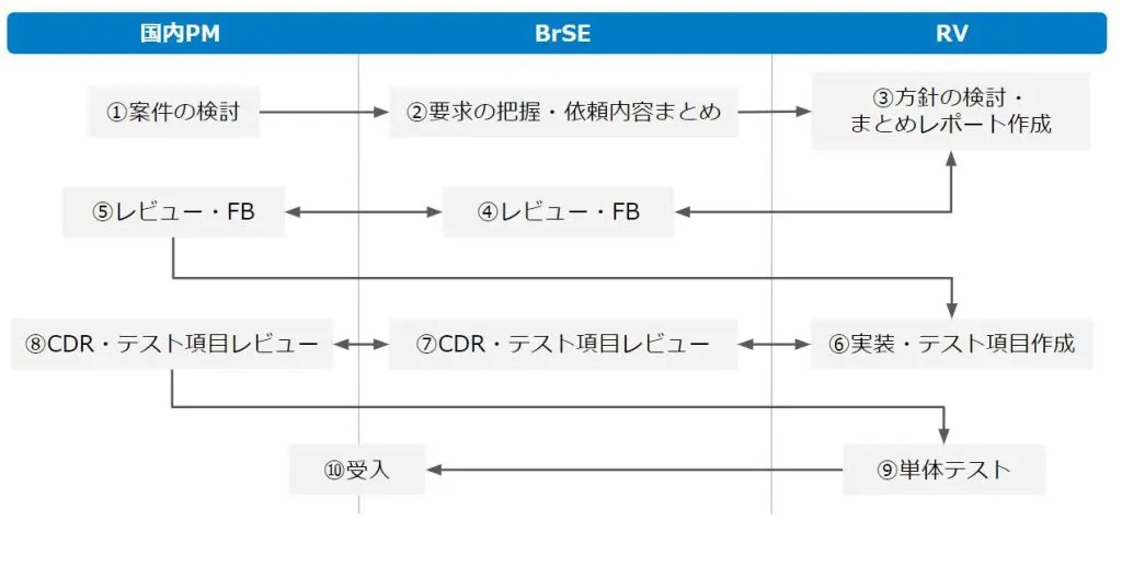 通常は、日本国内の開発チーム内で開発全体のPMをアサインし、BrSEがRVとの開発コミュニケーション支援を行います。 RVでは、設計・実装・単体テスト・第三者テストを行い、成果物をBrSEが受け入れる形で進めています。