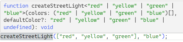 function createStreetLight<C extends string>(colors: C[], defaultColor?: C) { // ... } createStreetLight(["red", "yellow", "green"], "blue");